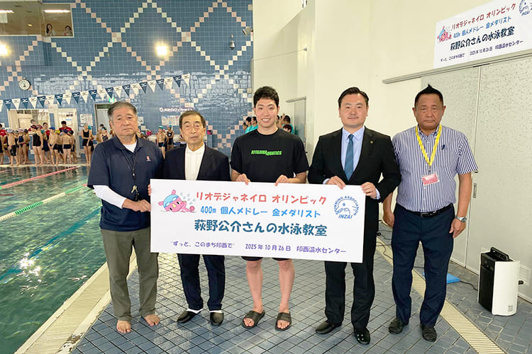 左から、印西市議会議員金丸和史さん、印西市水泳協会会長岩切博さん、萩野公介さん、印西市長藤代健吾さん、印西温水センター所長細谷