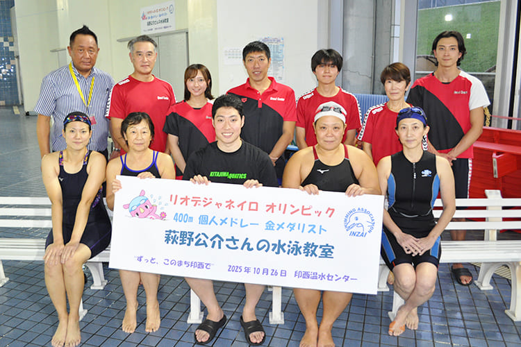 萩野公介さんを囲んで、印西温水センターの指導員スタッフ
